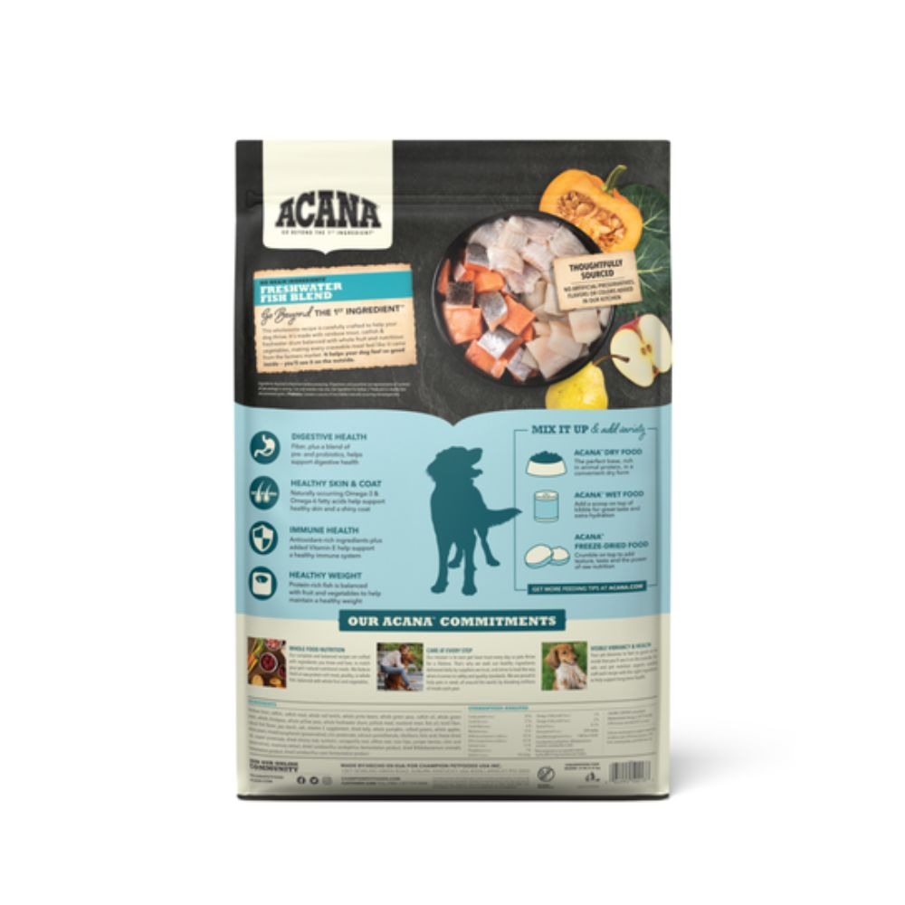 Bring home the quality nutrition your dog needs to thrive with ACANA™ Freshwater Fish Blend. Protein-rich raw rainbow trout, catfish & freshwater drum are balanced with whole pumpkin, collard greens, apples and pears to offer a delicious, nutritious option for your dog. This ACANA dog food is 60%1 animal ingredients and 40 percent2 fruits and vegetables. No artificial preservatives, flavors or colors added in our kitchen and no low-cost ingredients like soy, corn, tapioca or wheat to ensure your furry family member gets only the best. Even better, this dry dog food helps support digestive health with fiber, plus a blend of pre- and probiotics, and antioxidant-rich ingredients plus added Vitamin E help support a healthy immune system. Choose ACANA dry dog food kibble to give your companion the nutritional foundation they need to live a happy, healthy life.