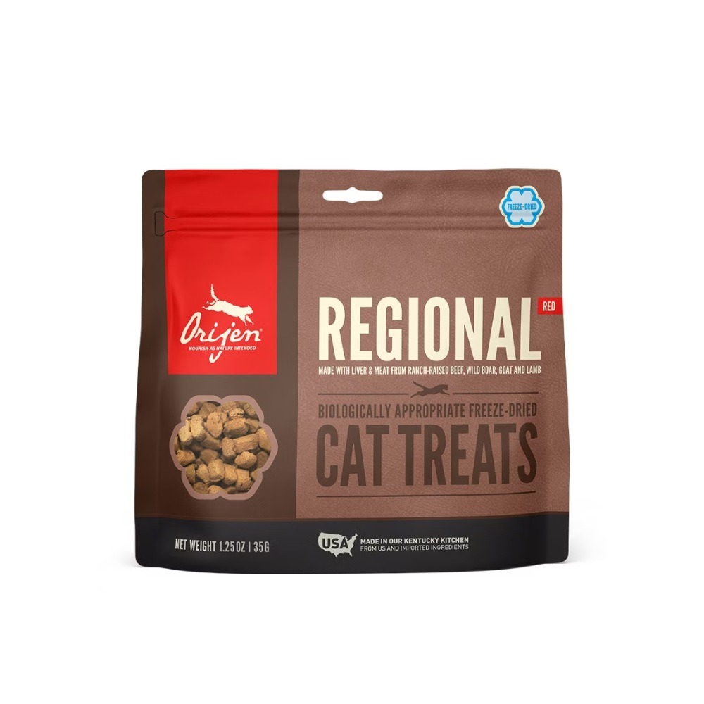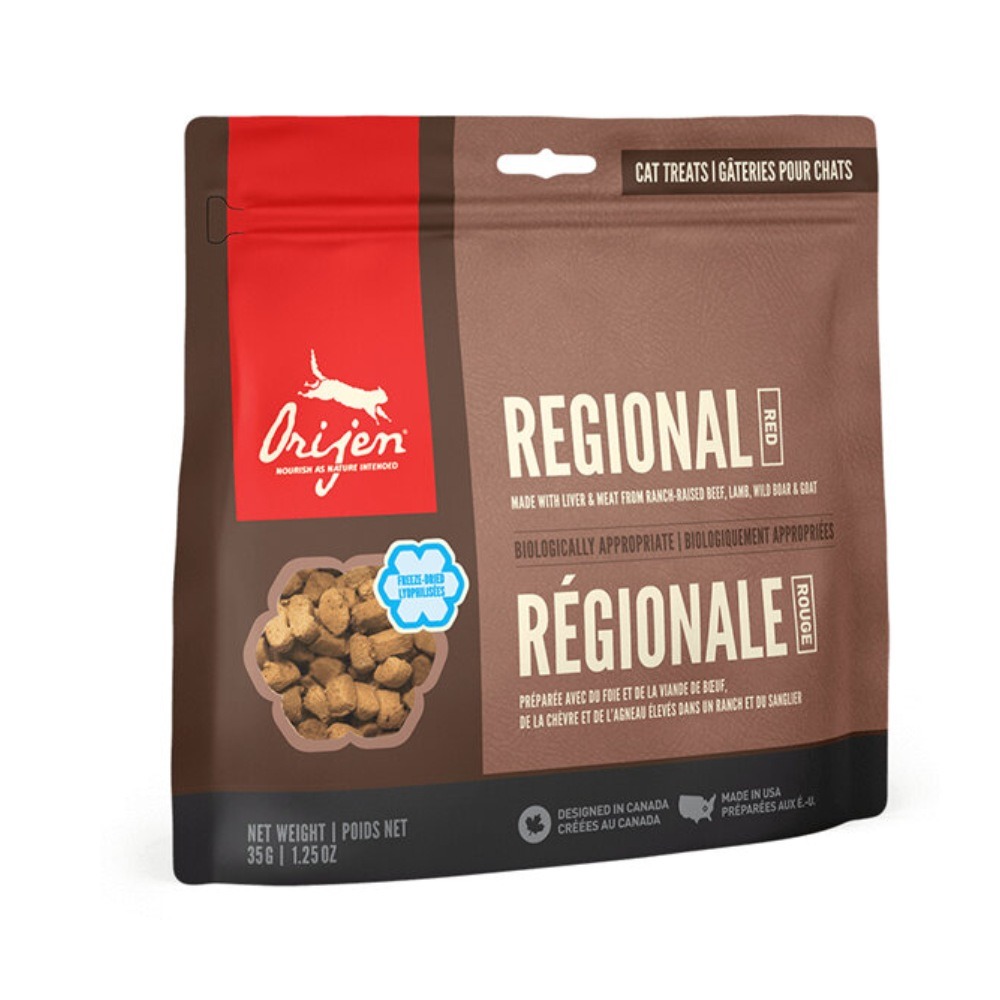 Treat your cat to nutritious and delicious ORIJEN® Freeze-Dried Treats. Packed with animal protein, our Regional Red® Recipe is made with 99% animal ingredients* including nourishing beef liver, goat, wild boar and lamb. Freeze-dried to lock in their rich nutrients and flavour, they’re packable and perfect for adventures. At just one calorie each, ORIJEN Freeze-Dried Treats are loaded with protein and amazing taste.